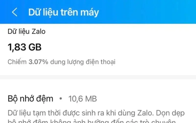 - Bước 2: Chọn Mục “Dung Lượng và Dữ Liệu”: Tại đây, bạn sẽ thấy tổng dung lượng Zalo đang chiếm dụng trên thiết bị. Hệ thống sẽ hiển thị thông tin chi tiết về dung lượng bộ nhớ đệm, hình ảnh, video, và các tệp khác. Lưu ý rằng, các con số này có thể khác với thông tin trên trang quản lý dung lượng hệ thống do cách tính toán khác nhau.